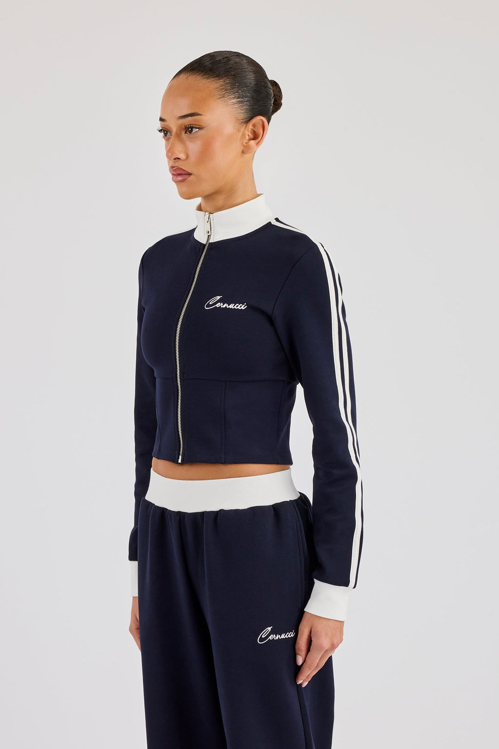 Soft touch navy zip through jacket in our premium soft touch, featuring contrast side stripes.