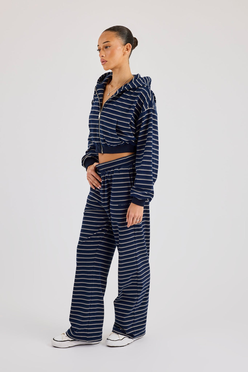 Soft touch striped navy trousers in a wide leg fit, made from premium cotton. Pair with the matching soft touch zip through to complete the look.