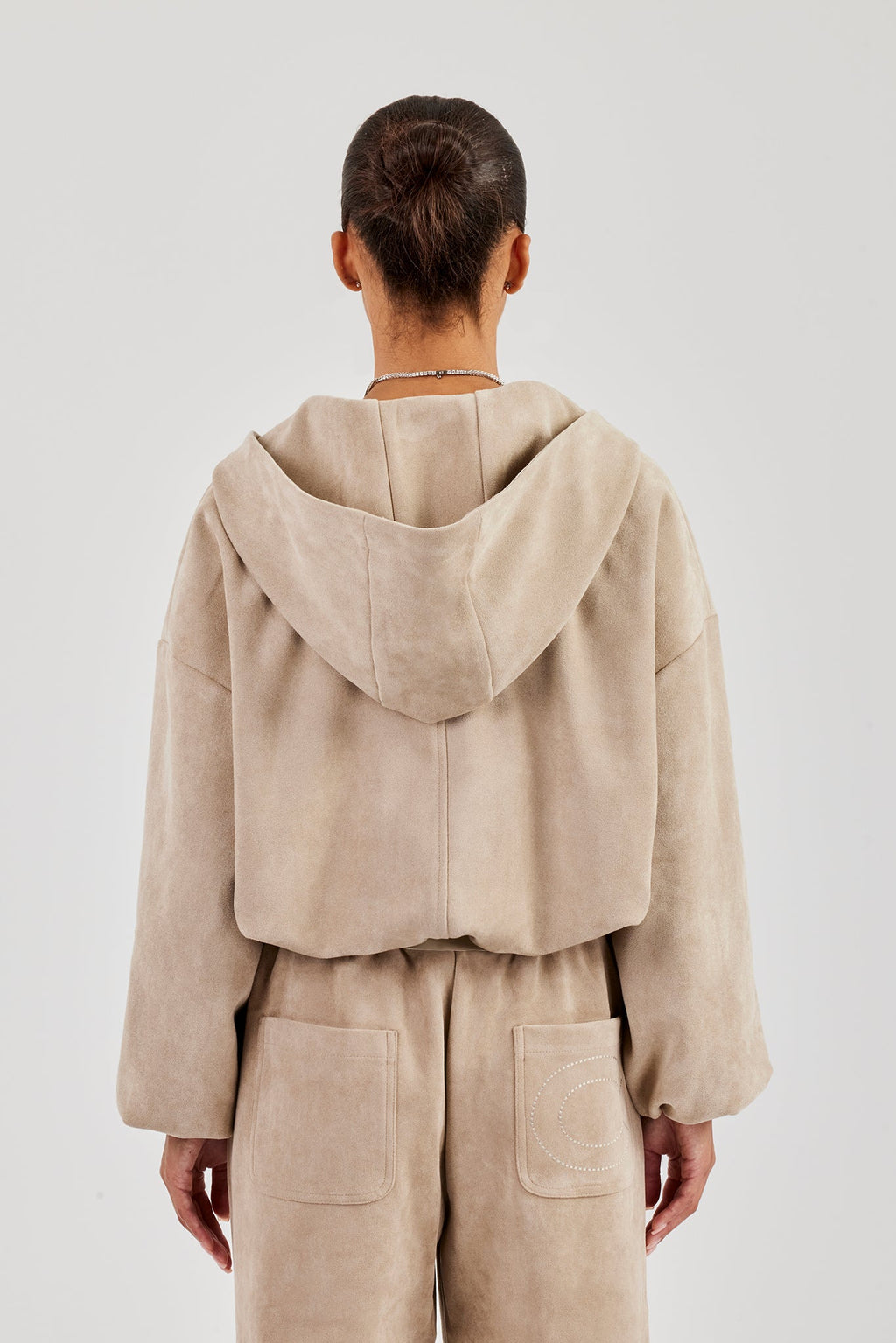 Beige hooded zip through jacket. Premium soft touch suede with branded trims.