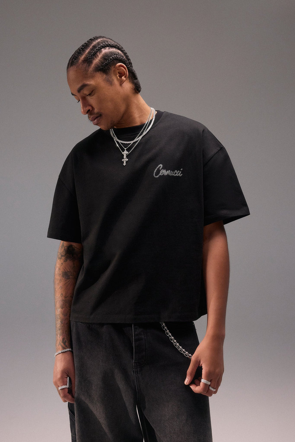 Black boxy fit t-shirt in a medium weight, soft touch cotton. Embellished with crystals by Swarovski®