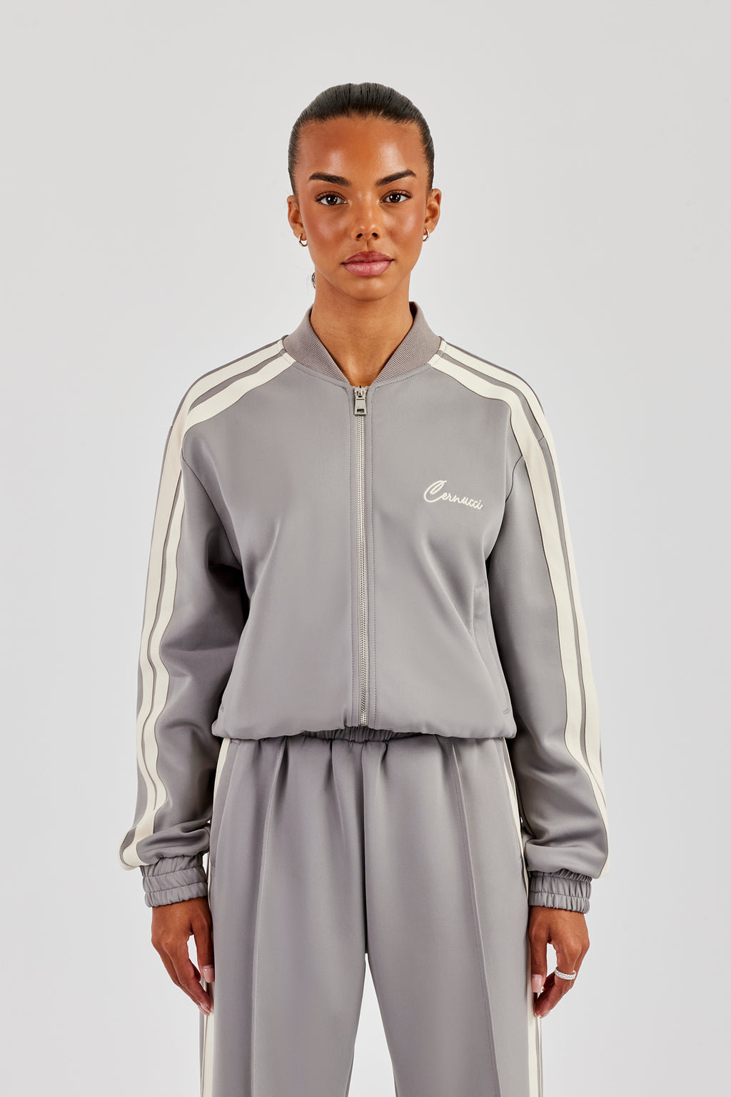 Grey zip front bomber with taping detail, in a mid weight poly with Cernucci branded embroidery.