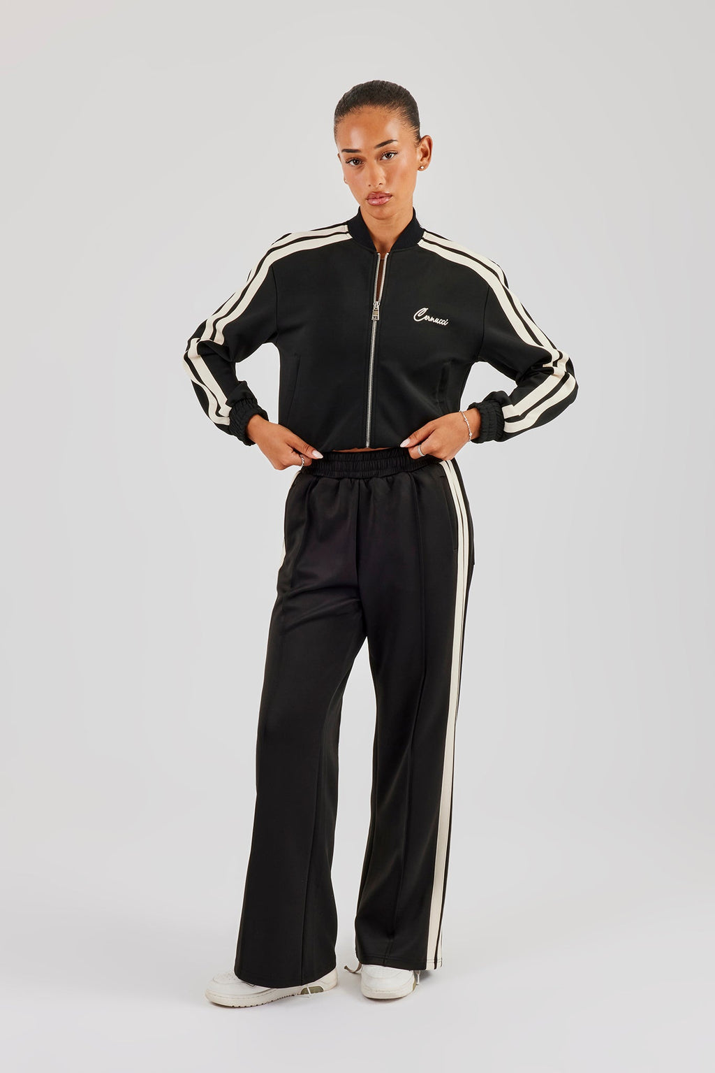 Black zip front bomber with taping detail, in a mid weight poly with Cernucci branded embroidery.