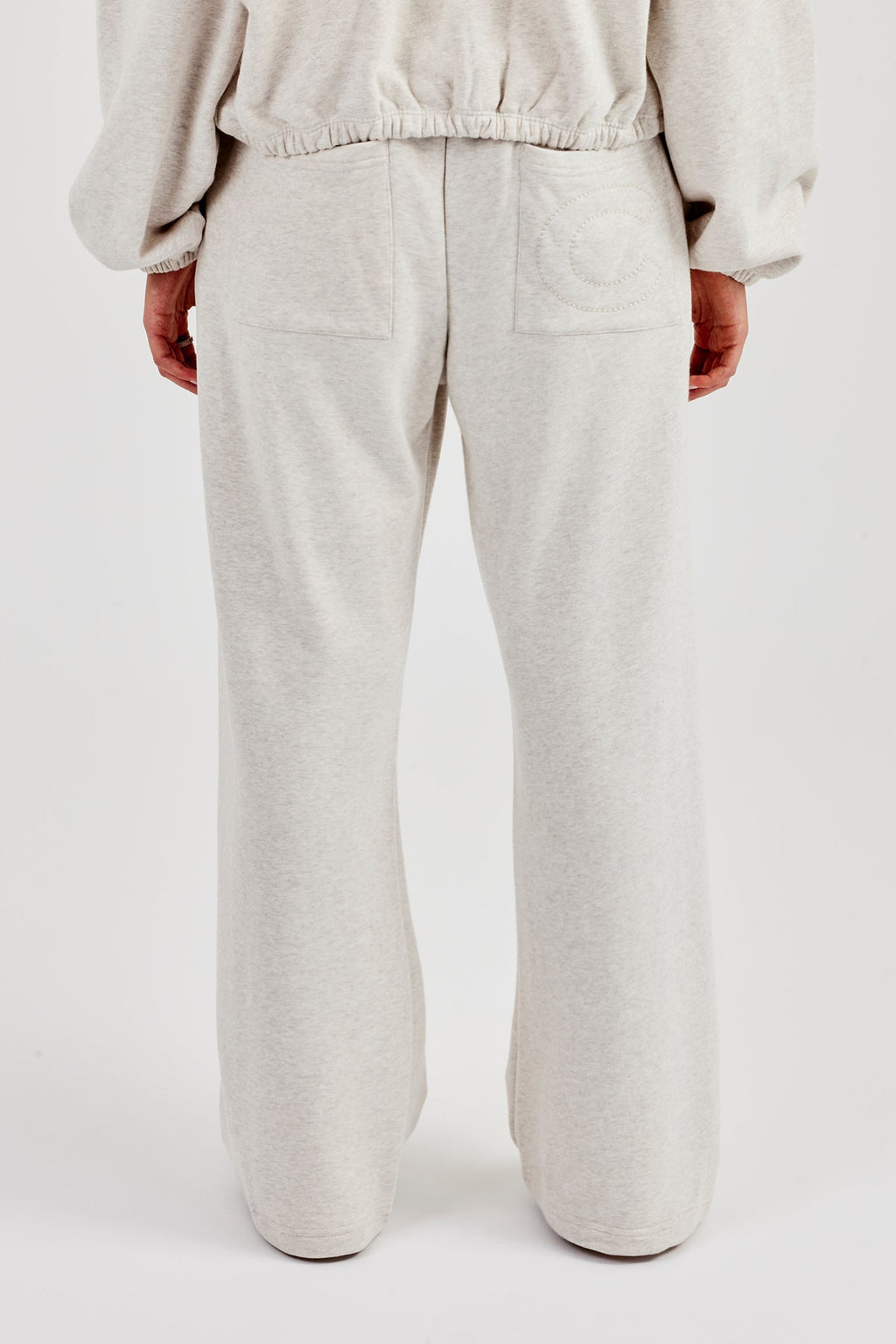 Grey marl, wide leg jogger. Premium heavyweight soft touch jersey with tonal towelling applique branding