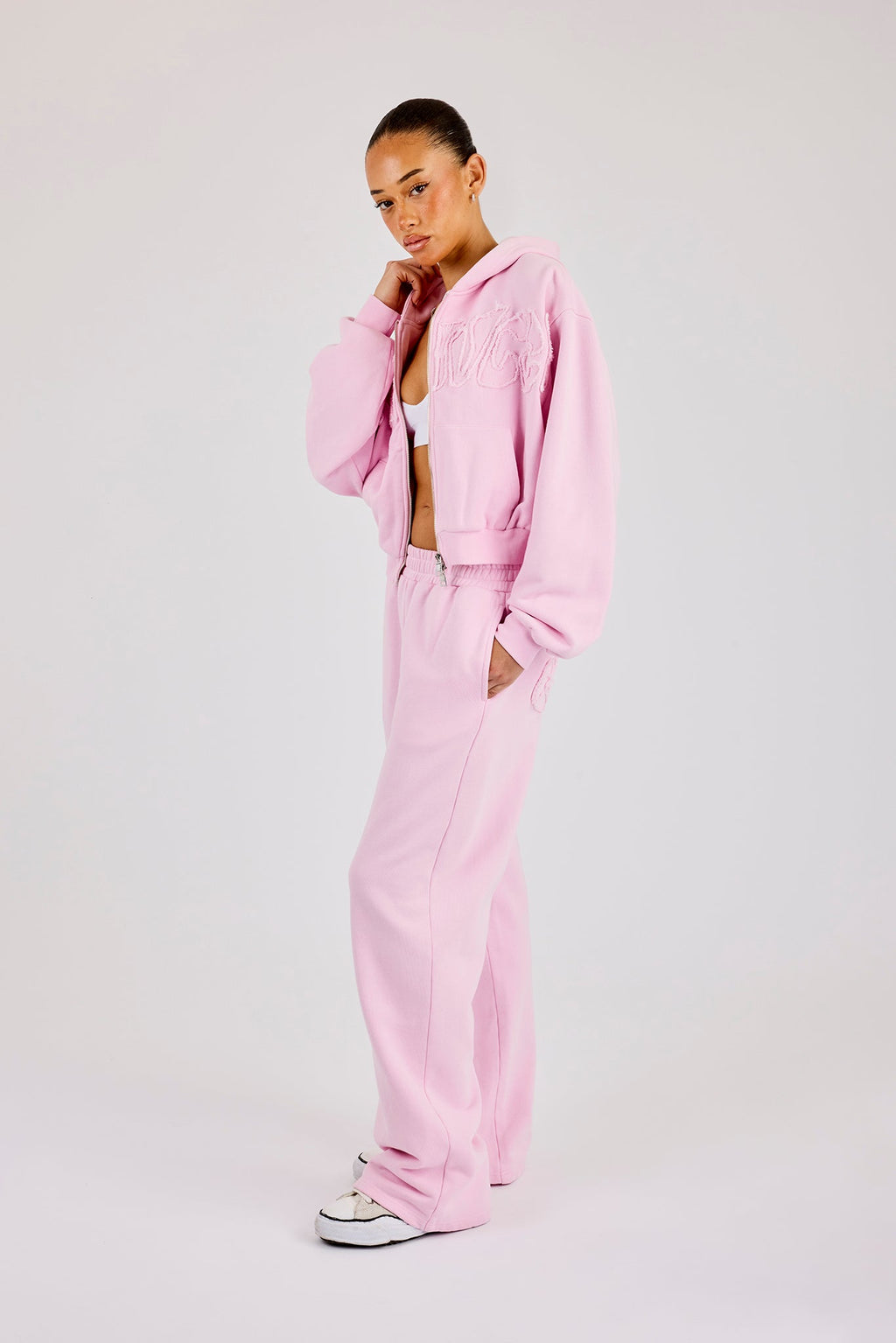 Pink wide leg jogger featuring applique logo. Premium soft touch jersey with Cernucci branded PU patch on centre back waistband.